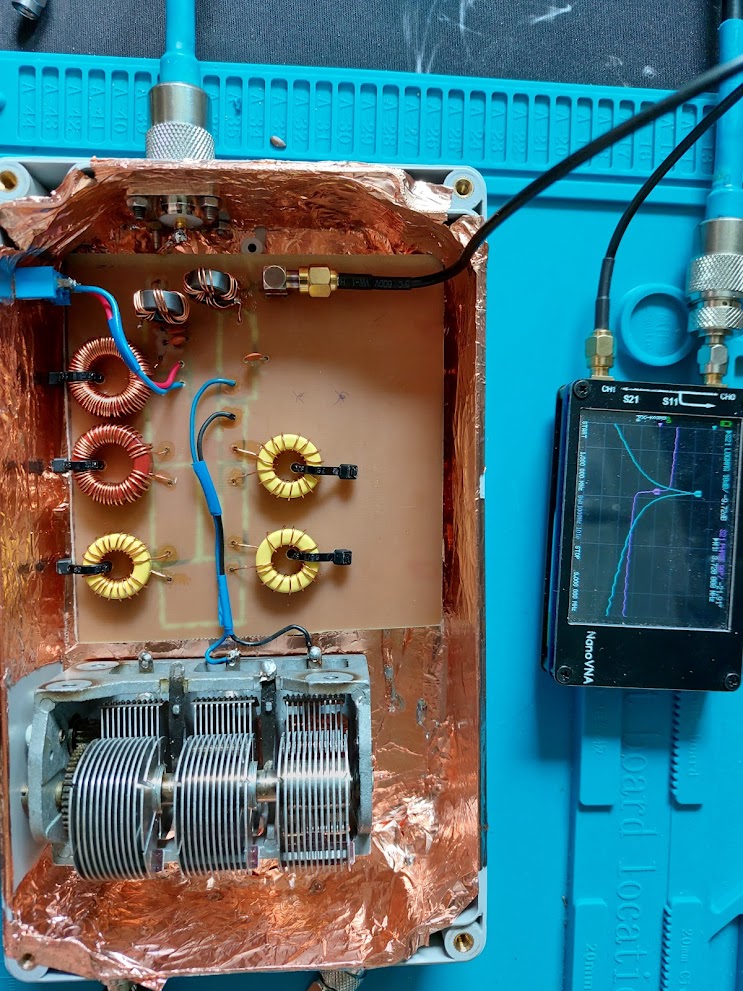 I screened the case with copper tape before I installed all listed components. PCB was prepared using just hand drill due to quite not complicated connections(in case of just 2 bands to be covered). If you decide to build up the complex version, PCB is available within the PDF linked in the bottom of this page.