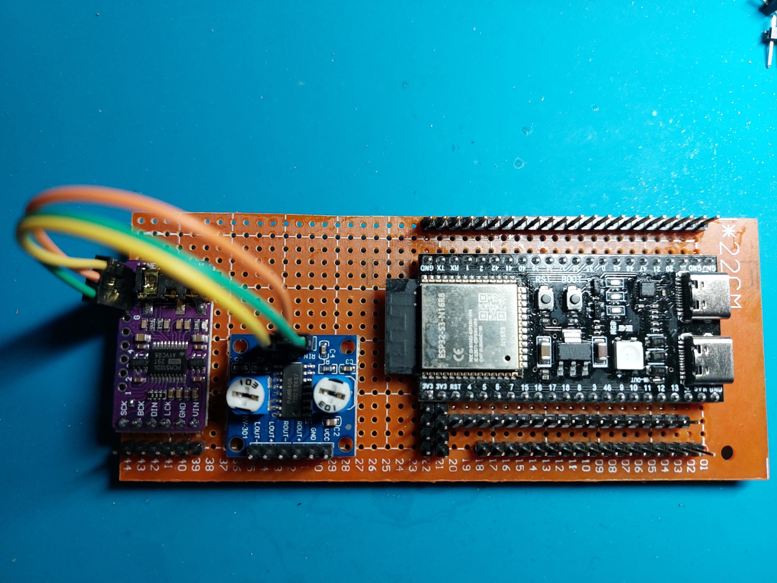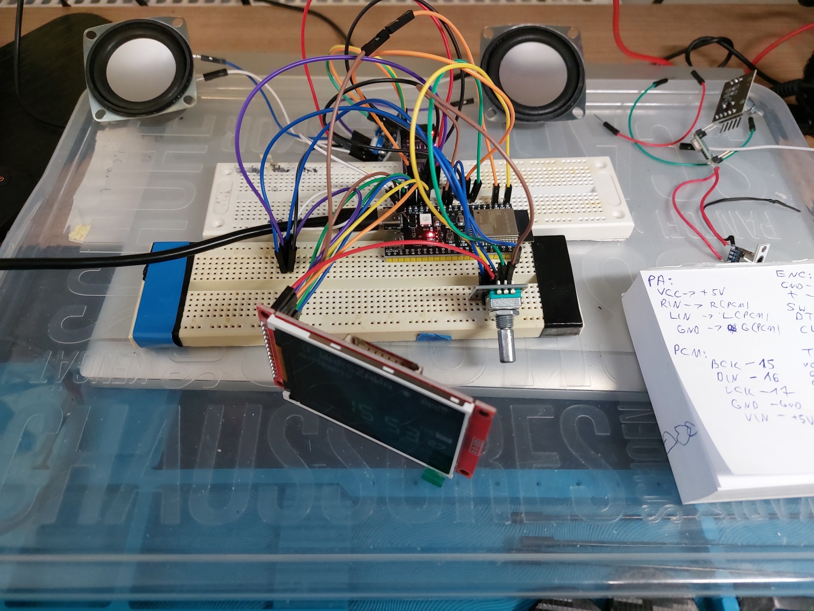 The PCM converter should also be powered from an independent 5V voltage source. Using the 3.3V supply from the ESP32 board caused significant AUDIO signal distortion in my case.
